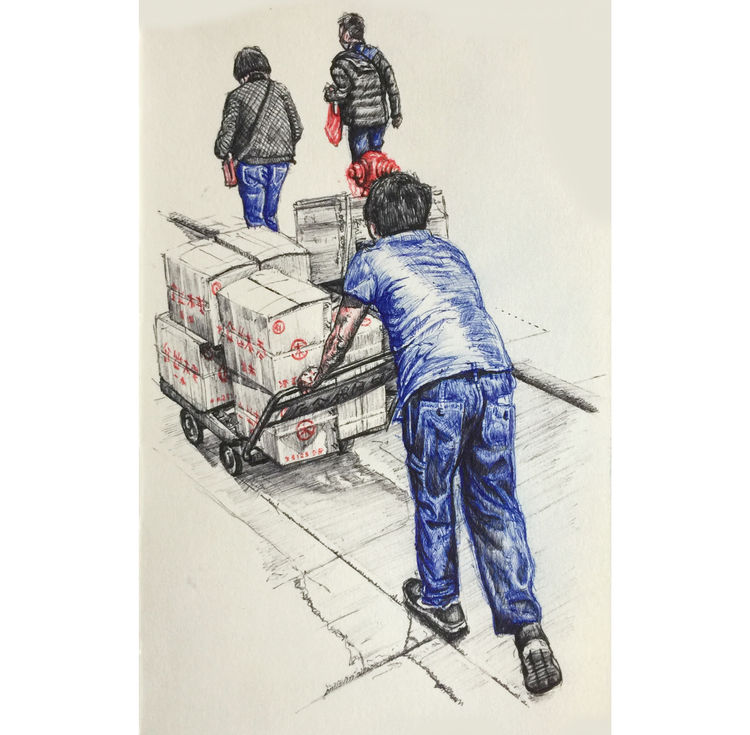 Delivery Worker - Tri-colour biro sketch showing a snapshot of daily city life in Hong Kong.