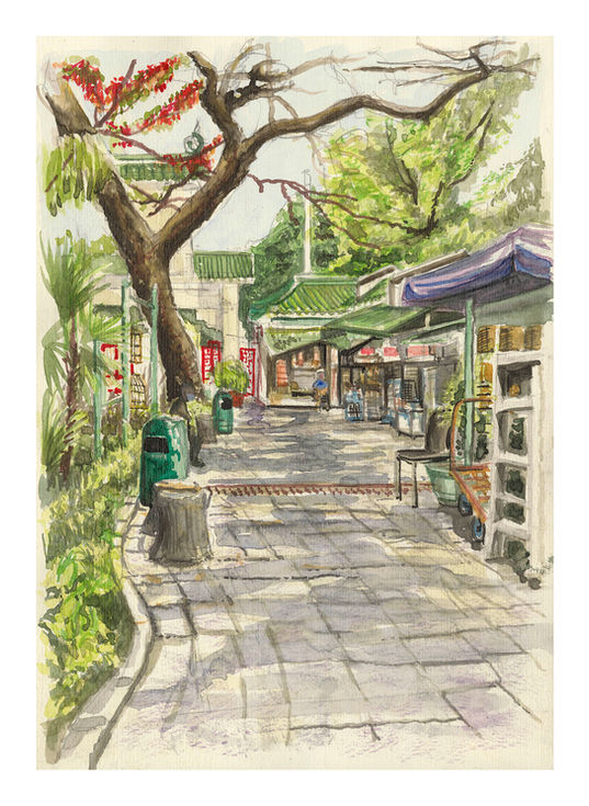 On location 'Plein air' watercolour sketch of the Bird Market near Prince Edward and Mong Kok districts in Kowloon, Hong Kong. One sunny afternoon, I came across this lovely scene and listened to the bird songs as I painted this leafy scene.
