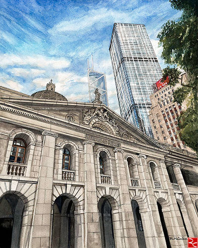 Watercolour artwork of the majestic Court of Final Appeal building, near statue square in the heart of the CBD of Hong Kong with marvellous sculptural architectural details. Interestingly, this beautiful neo-classical style building was opened in 1912 & was designed by the same architects who designed the facade of Buckingham Palace.